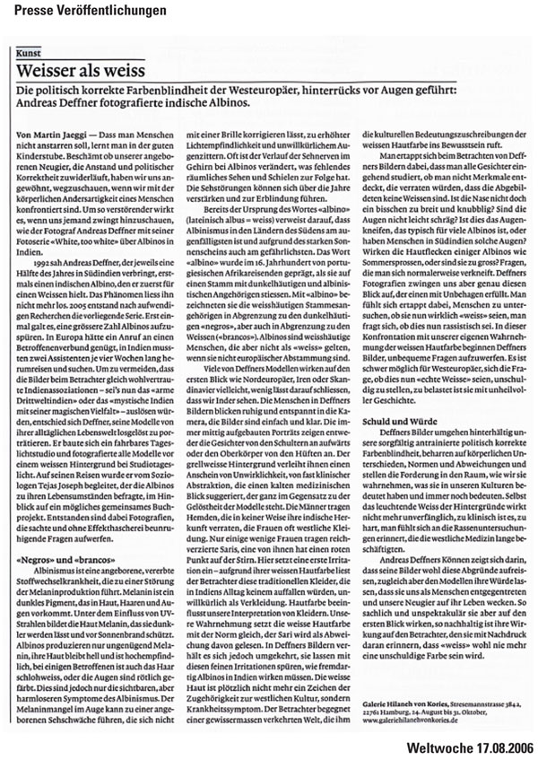 Vom 24. August bis 15. Dezember 2006 präsentiert die Galerie Hilaneh von Kories in Hamburg in der Ausstellung »White, too white« einen Bilderzyklus des Berliner Fotografen Andreas Deffner. Gezeigt werden Portraits indischer Menschen, die von Albinismus betroffen sind. Albinismus ist ein genetisch bedingter Pigmentmangel in Haut, Haaren und Augen, der immer auch die Sehkraft beeinträchtigt. Die Betroffenen leiden unter extremer Lichtempfindlichkeit.