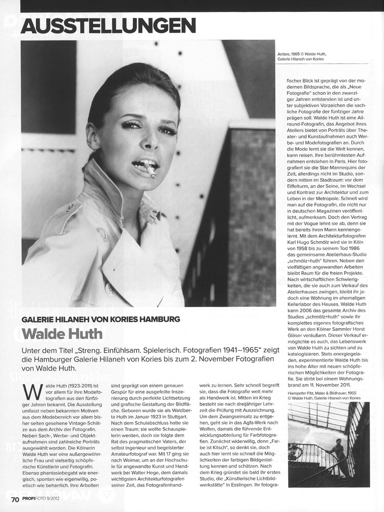 Nach wirtschaftlichen Schwierigkeiten, die sie auch zum Verkauf des Atelierhauses zwingen, bleibt ihr jedoch eine Wohnung im ehemaligen Kellerlabor des Hauses. Walde Huth kann 2006 das gesamte Archiv des Studios „schmölz+huth“, sowie ihr komplettes eigenes fotografisches Werk an den Kölner Sammler Horst Gläser veräußern. Dieser Verkauf ermöglichte es auch, das Lebenswerk von Walde Huth zu sichten und zu katalogisieren. Stets energiegeladen, experimentierte Walde Huth bis ins hohe Alter mit neuen schöpferischen Möglichkeiten der Fotografie. Sie stirbt bei einem Wohnungsbrand am 11.11.2011. Die Ausstellung entstand in Kooperation mit dem Kölner Archiv von Horst Gläser, der das fotografische Werk von Walde Huth und Karl Hugo Schmölz betreut. Die Hamburger Galerie-Präsentation der Vintage- Aufnahmen wird durch eine exklusive Modern Print-Edition mit sieben Modeaufnahmen ergänzt. |